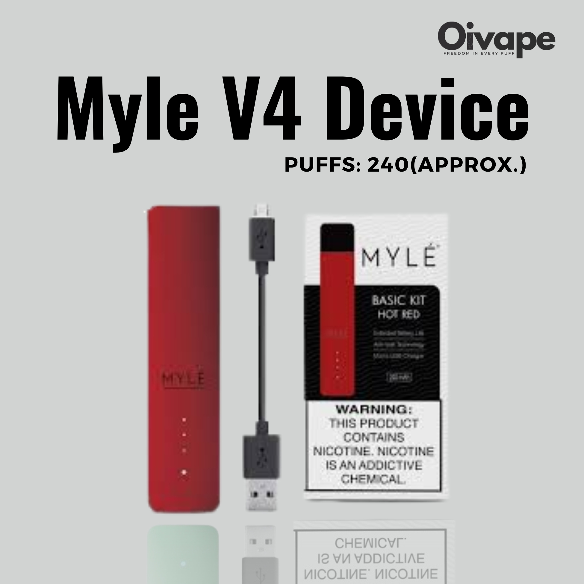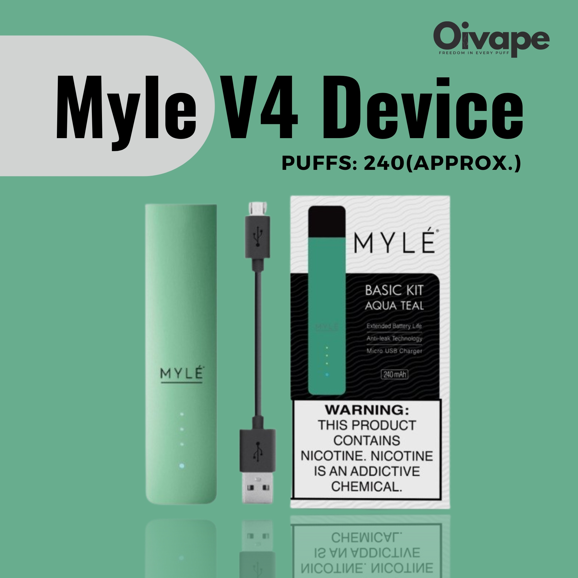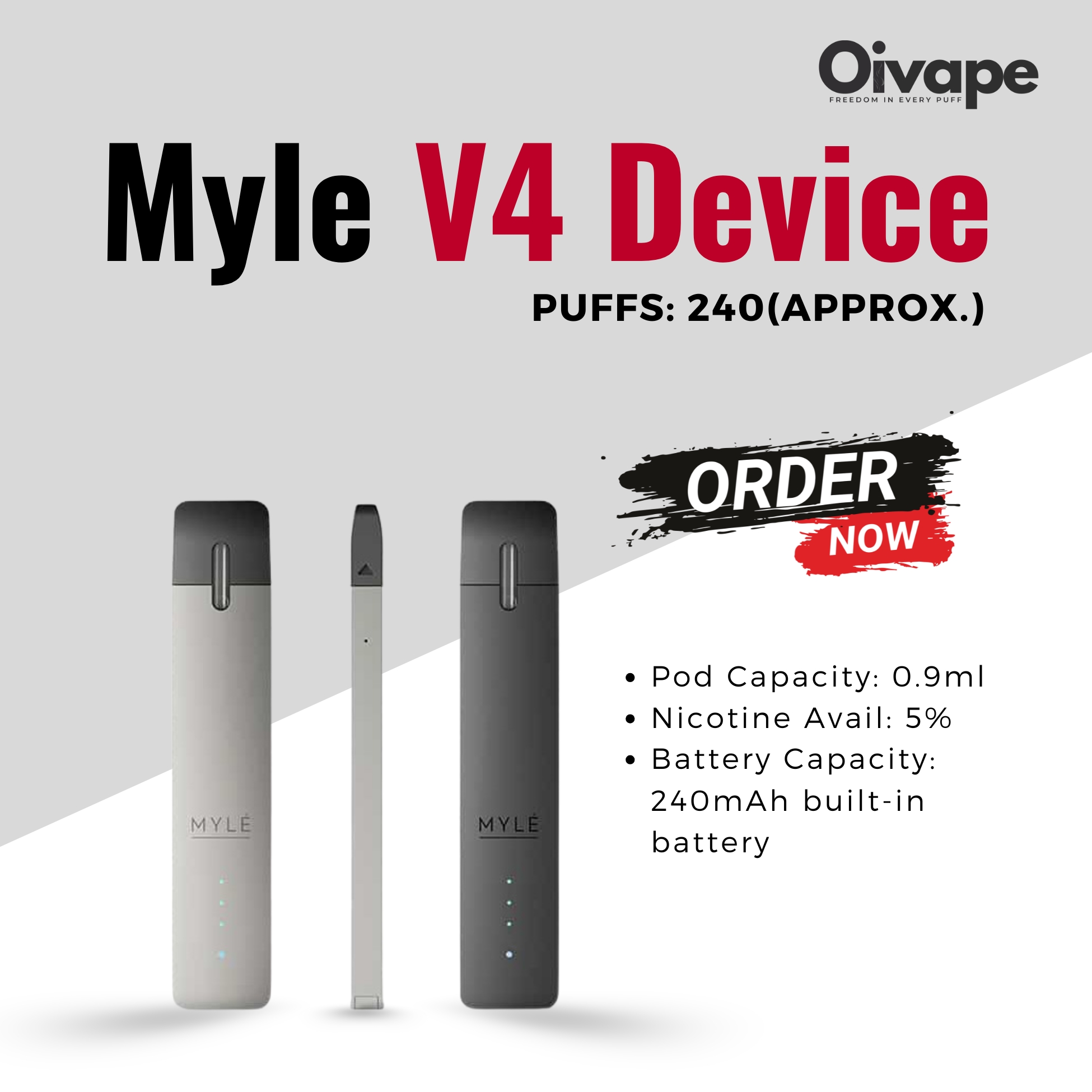 | Included in Box | 1× Myle V4 Device, 1× Charging Cable, 4× Pods |